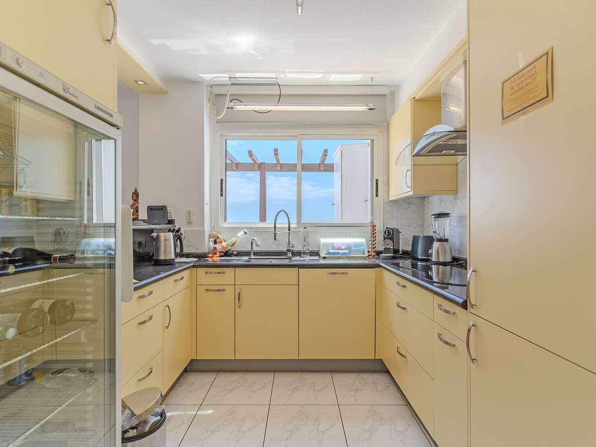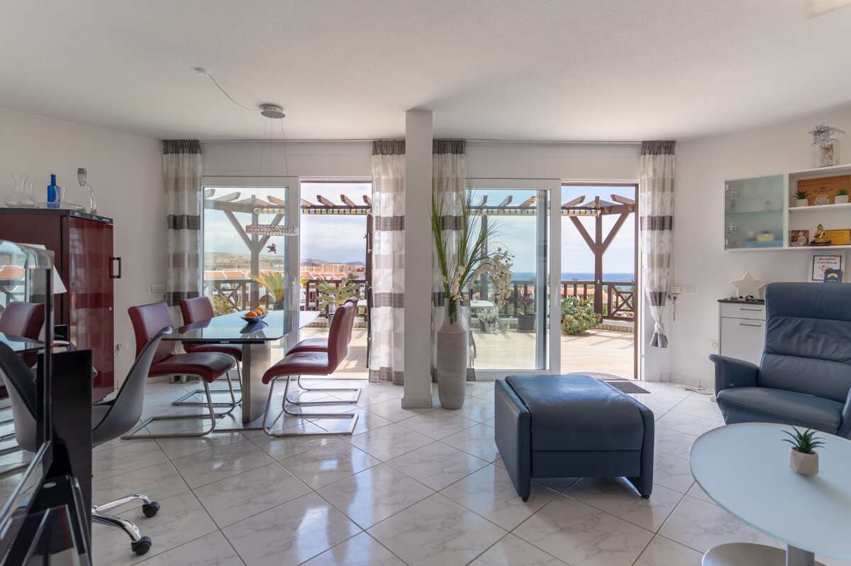 La propiedad cuenta con una superficie total construida de 164 m², de los cuales 92 m² corresponden a la superficie útil interior, y 72 m² a una impresionante terraza que envuelve el apartamento. Esta amplia terraza ofrece vistas espectaculares tanto al océano como a las montañas, y gracias a su orientación y diseño, permite disfrutar de zonas soleadas y sombreadas a lo largo del día, creando distintos ambientes para el descanso o el ocio.